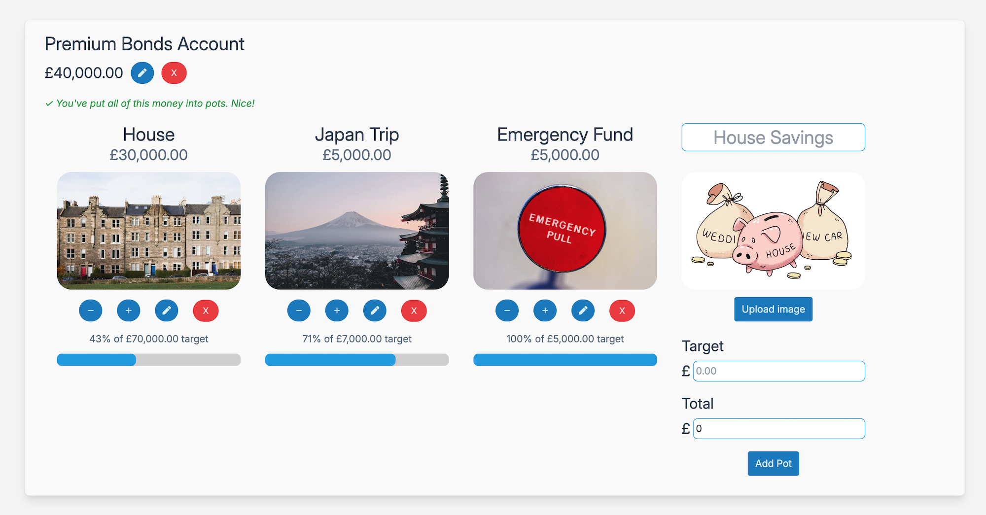 Are you saving for a new car, a home, or that designer coat for your dog? Create a pot for whatever it is you're saving for and get some visibility of your savings.